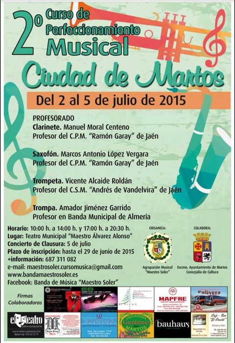 Presentamos el cartel del II Curso de Perfeccionamiento Musical "Ciudad de Martos" organizado por nuestra Banda de Música y con la colaboración del Excmo. Ayuntamiento de Martos y varios comercios marteños, y que irá destinado a músicos de todos los niveles.